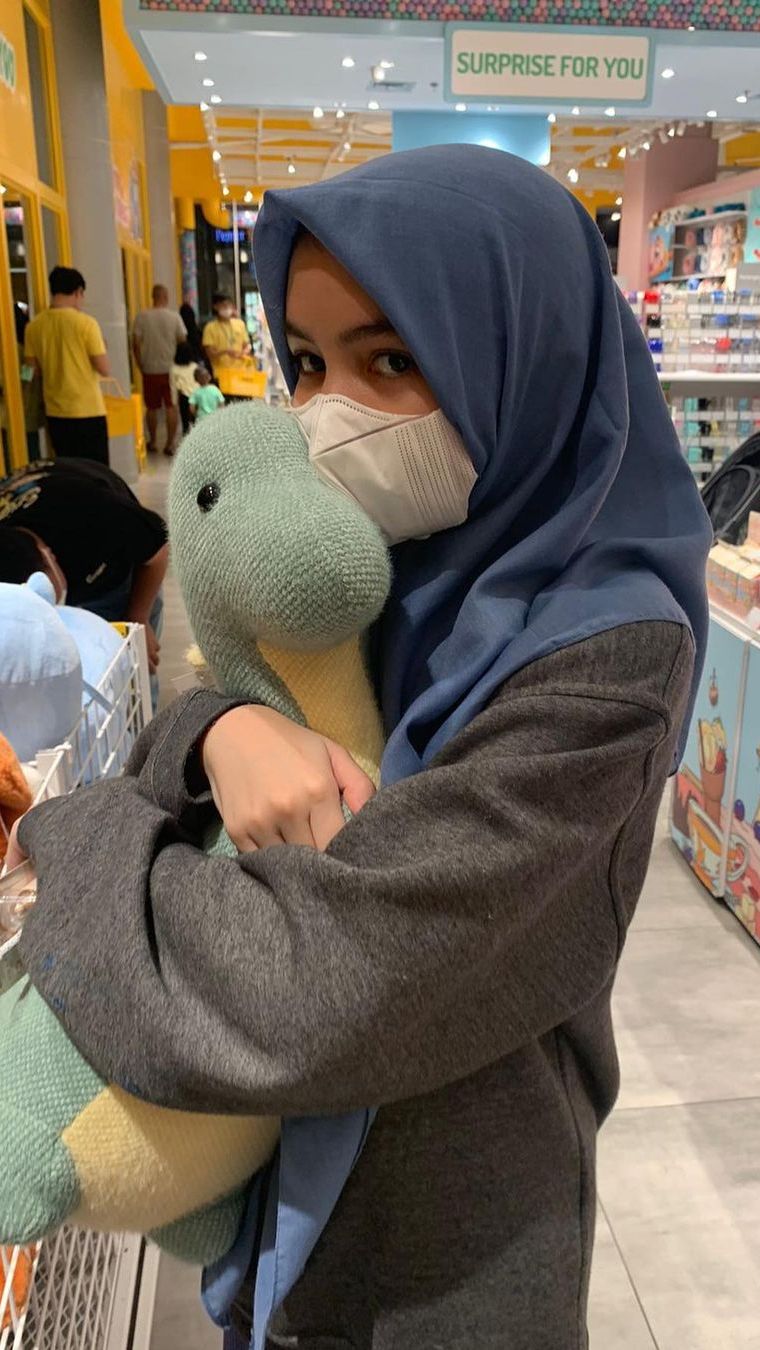 Outfit Sienna saat mengunjungi mall ini terlihat sangat simpel. Ia mengenakan sweater abu-abu sebagai luaran yang dipadukan dengan hijab segi empat warna biru denim.