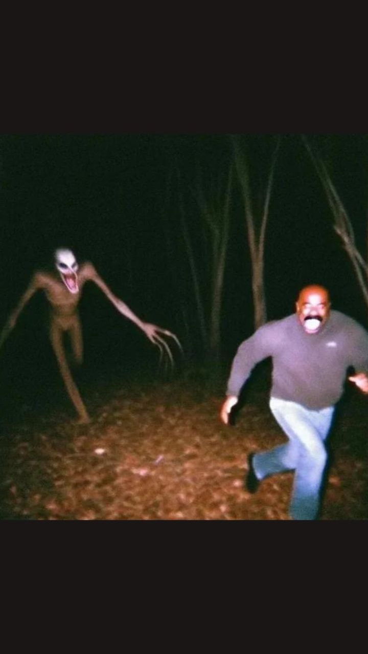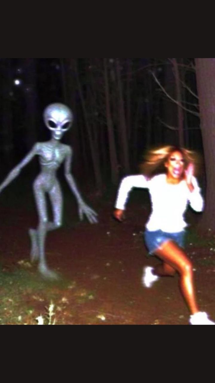 Mereka dikejar oleh sosok alien tinggi nan menyeramkan di hutan belantara pada malam hari. Unggahan ini dibuat dengan teknologi artificial intelligence (AI) atau kecerdasan buatan.